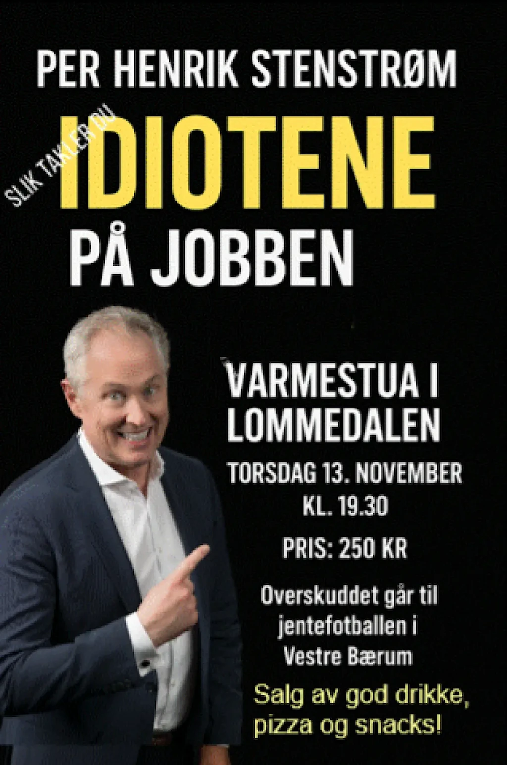 Nå kommer "Slik takler du IDIOTENE PÅ JOBBEN" til Lommedalen og UBK – Per Henrik Stenstrøms fantastiske foredrag som har gått Norge rundt og er sett av tusenvis av mennesker allerede! En runde med latter, gjenkjennelse og skarpe observasjoner. Dette er kvelden du ikke vil gå glipp av – nytt innhold, samme rå energi. Per Henrik stiller gratis opp for oss og overskuddet går til jentefotballen i Bærum. Det serveres mat, snacks og god drikke. Velkommen!»